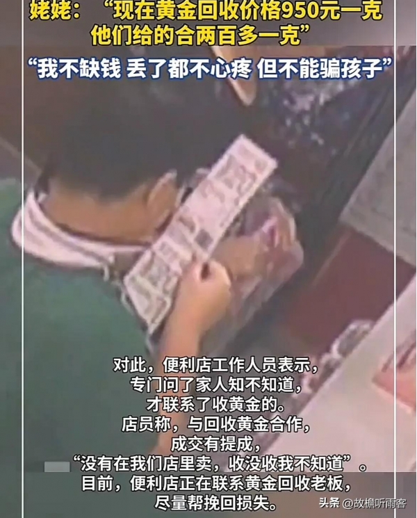 涉事便利店工作人员事后辩称,他们在联系回收商前曾询问男孩家人知不知情,男孩口头回答知道,于是便协助完成了交易。同时该员工承认,店内与黄金回收存在合作关系,每促成一笔交易可获得提成。然而,对于如此大额且涉及未成年人的财产处置,既无身份核实,也未要求监护人到场或提供书面同意,整个流程形同虚设。